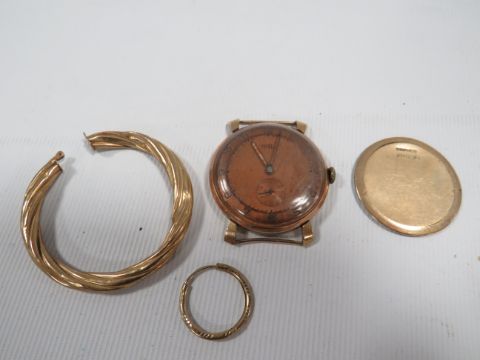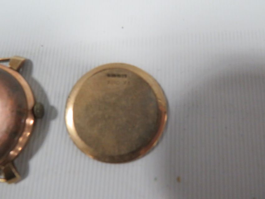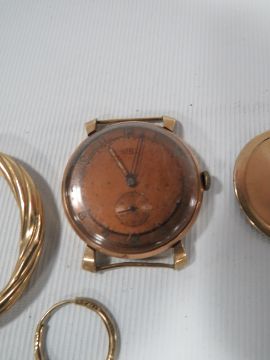 A HALLMARKED 9K GOLD ROTARY WATCH BACK PANEL TOGETHER WITH TWO ODD YELLOW METAL EARRINGS AND A YELLOW METAL CASED VINTAGE TREBEX WATCH