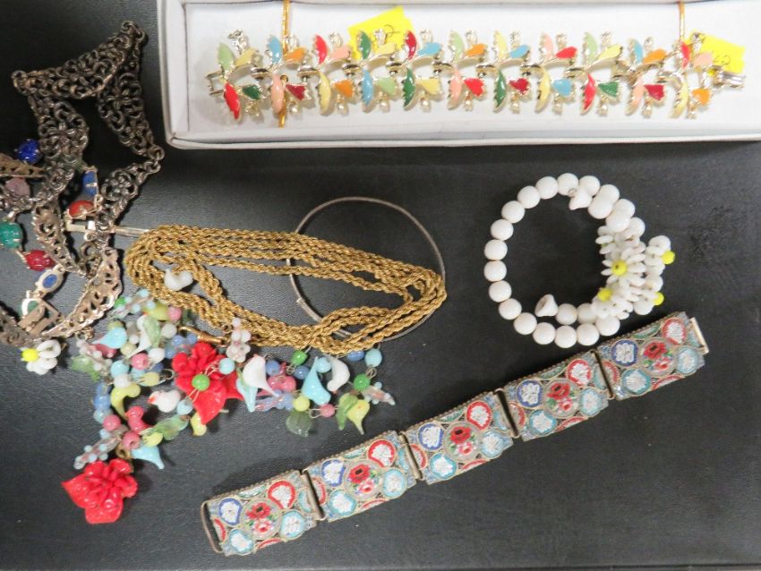 A SELECTION OF VINTAGE COSTUME JEWELLERY TO INCLUDE A MICRO MOSAIC PANEL LINK BRACELET , A YELLOW METAL MUFF CHAIN, STERLING SILVER BANGLE ETC