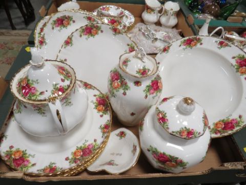 FOUR TRAYS OF ROYAL ALBERT OLD COUNTRY ROSES TO INCLUDE TEA/DINNER WARE, VASES , TUREEN, JUGS, ETC