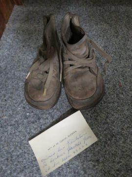 A TRAY OF COLLECTABLE'S TO INCLUDE CAMERAS , LEATHER COLLAR BOX ETC TO INCLUDE A TRAY WITH A VINTAGE DOLL AND SMALL HAND MADE SHOES