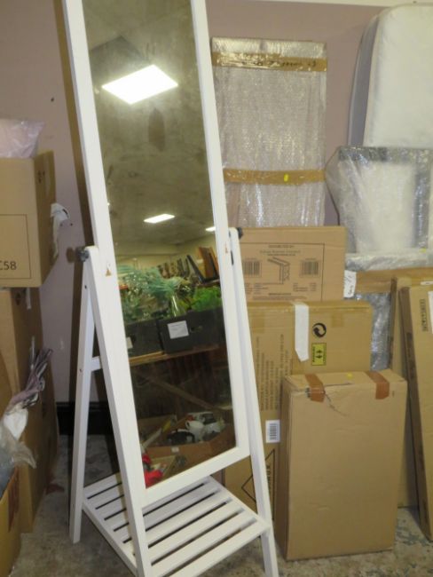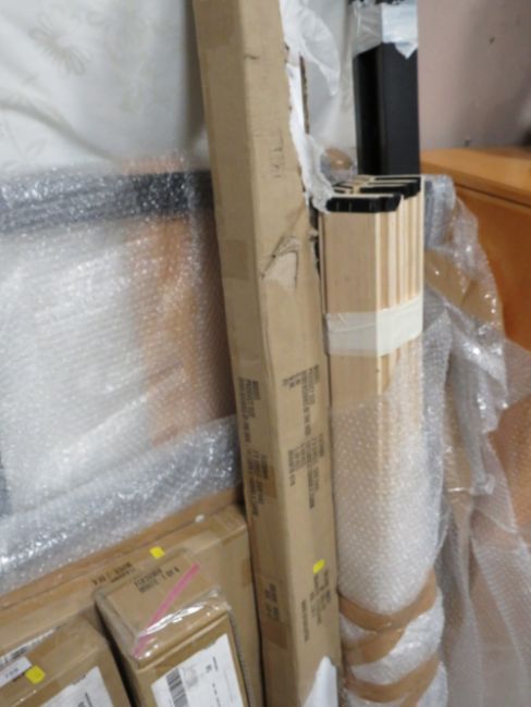 A SELECTION OF FLAT PACK FURNITURE WINDOW BLINDS, SINGLE TUBULAR FRAMED BED & AN IKEA FREE STANDING MIRROR (CONTENTS UNCHECKED)