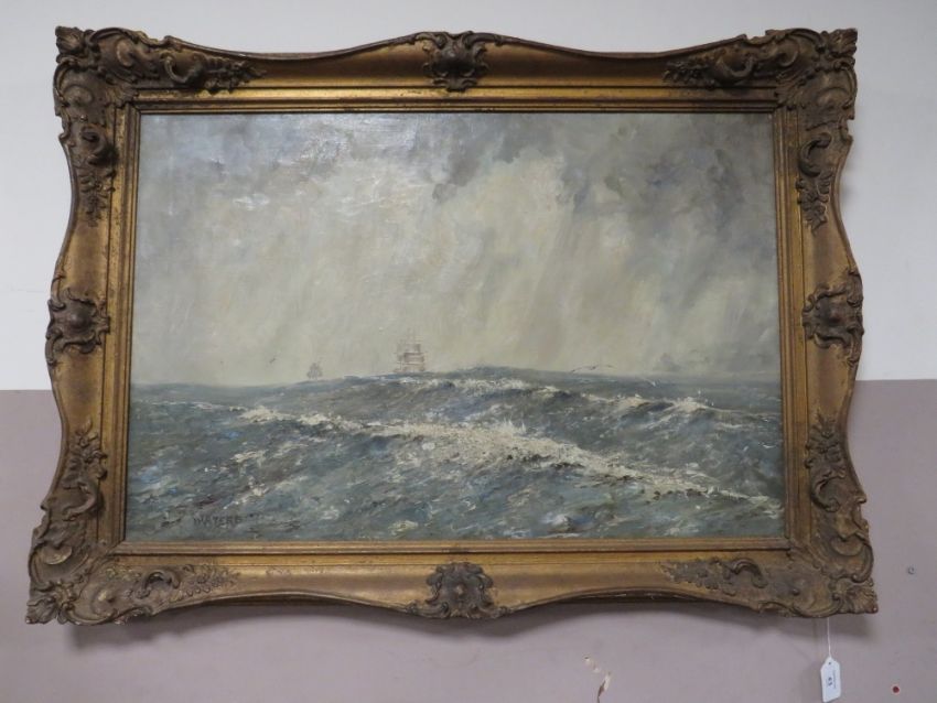 CAPT. JOHN WATERS (XX). Stormy seascape with sailing vessels in a heavy swell 'Off Coquirubo 06, a Good Landfall, Cape Horn at Last', see label verso, signed lower left, oil on canvas, framed, 50 x 75 cm