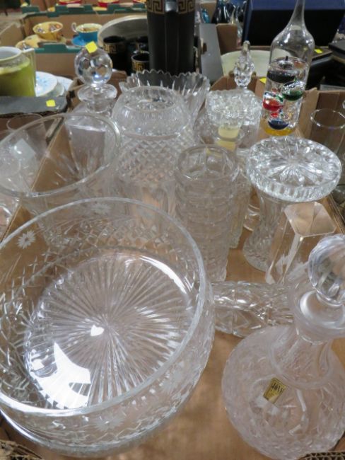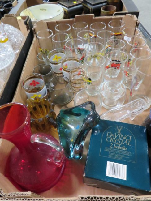 THREE TRAYS OF ASSORTED GLASSWARE TO INCLUDE BOWLS, VASES AND DRINKING GLASSES ETC