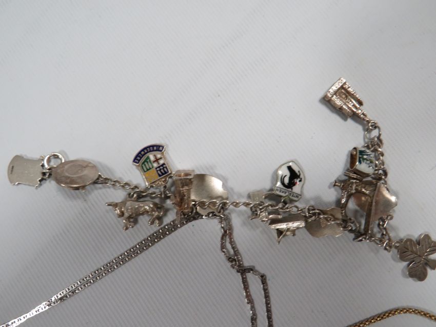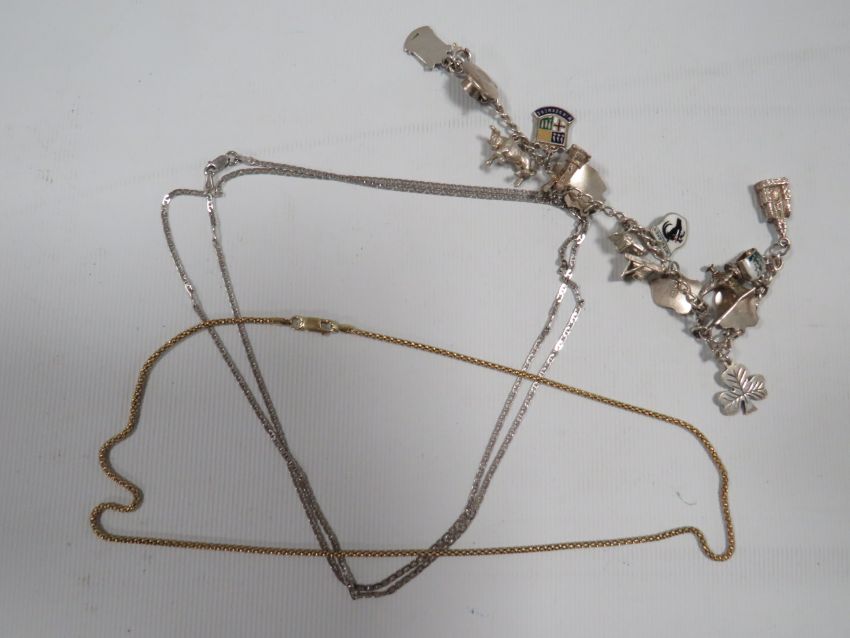 A SILVER CHARM BRACELET AND TWO SILVER NECK CHAINS