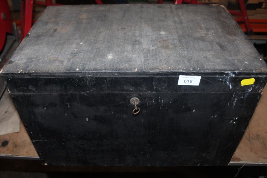 A LOCKING WOODEN CARPENTERS TOOL BOX AND CONTENTS SPANNER ETC