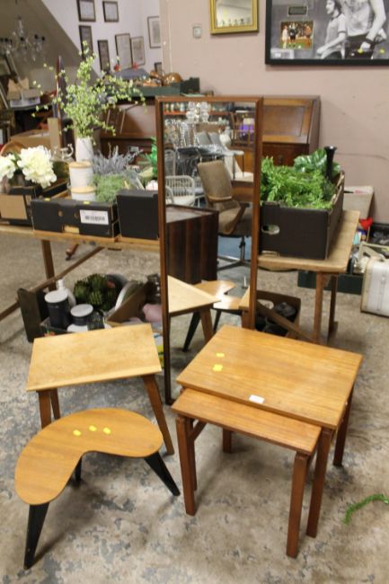 TWO VINTAGE TEAK DANISH TABLES TOGETHER WITH A KIDNEY TABLE, OAK OCCASIONAL TABLE & A MIRROR
