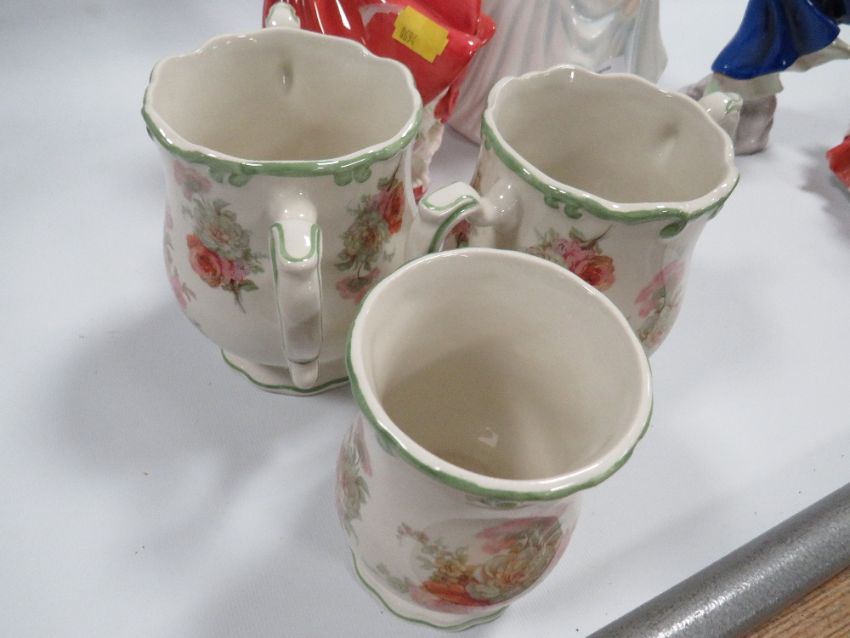 FOUR ROYAL DOULTON FIGURES TO INCLUDE MAY, DIANA, TOP O' HILL. AUTUMN BREEZES , TOGETHER WITH THREE WINTON POTTERY MUGS