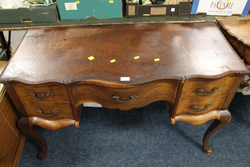 A VINTAGE MAHOGANY ? DRESSING TABLE TOGETHER WITH HALF MOON CONSOLE TABLE & TROLLEY