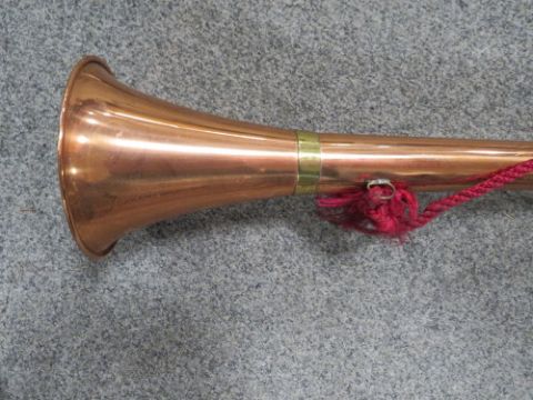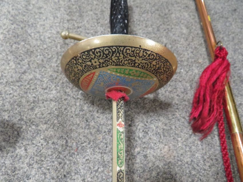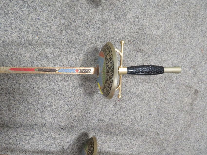 FOUR DECORATIVE FENCING FOILS TOGETHER WITH A COPPER HUNTING HORN