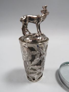 A COLLECTORS LOT OF HALLMARKED AND STERLING SILVER TO INCLUDE AN ENAMEL HANDLED MAGNIFYING GLASS - LONDON 1934, a modern pair of grape scissors - London 1977, small pieced glass lined shot cup, hallmarked bottle stopper in the form of a deer and a shaped patch box (5)