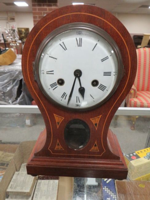 AN EDWARDIAN WOODEN CASED BALLOON SHAPED MANTLE CLOCK KEY (NO PENDULUM)