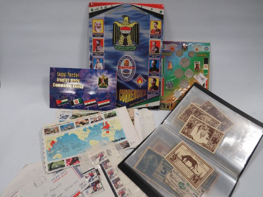 A COLLECTION OF WORLD BANKNOTES, TO INCLUDE EXAMPLES FROM CHINA, IRAQ, JAPAN, ETC, ALONG WITH STAMPS & COINS