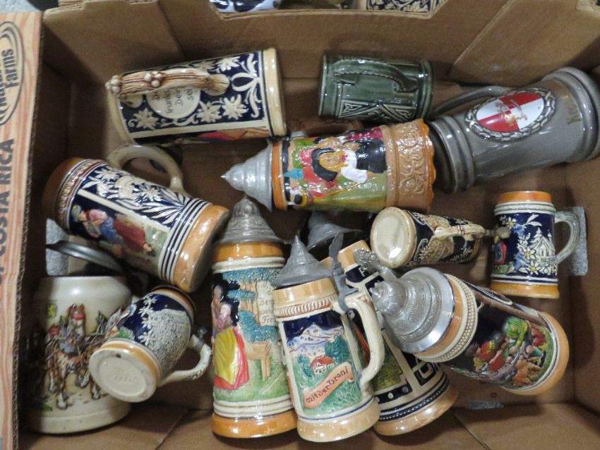 A LARGE COLLECTION OF ASSORTED BEER STEINS, TOBY AND CHARACTER JUGS OVER FOUR TRAYS