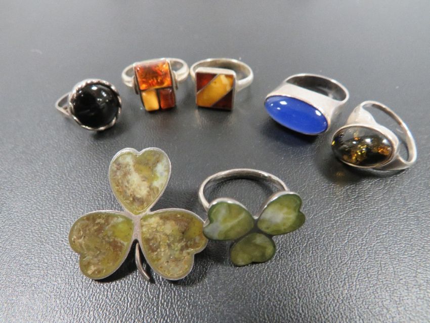 A SILVER HARD STONE CLOVER BROOCH TOGETHER WITH A MATCHING RING AND FIVE DRESS RINGS