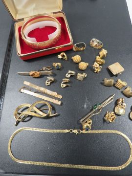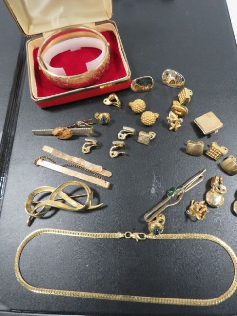 A SELECTION OF YELLOW METAL JEWELLERY TO INCLUDE A 9CT METAL CORE CLASP BANGLE