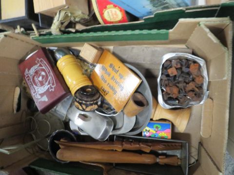 FOUR TRAYS OF VINTAGE TINS, BRASS ETC