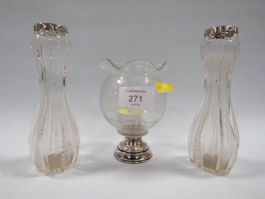 A HALLMARKED SILVER BASED GLASS VASE TOGETHER WITH A PAIR OF HALLMARKED SILVER RIMMED BUD VASES