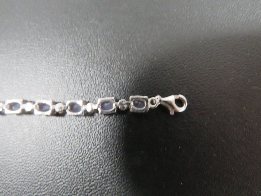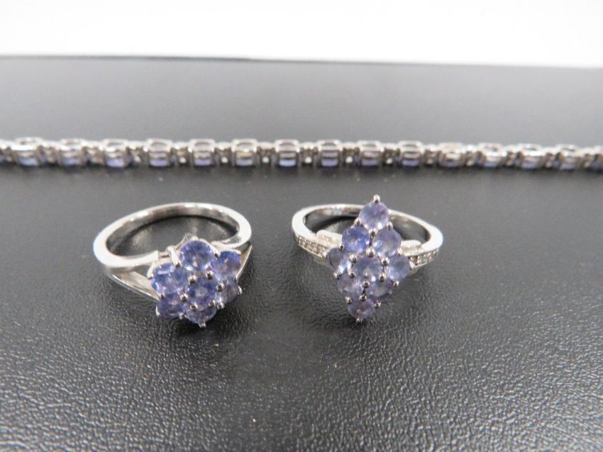 A 925 SILVER BRACELET SET WITH TANZANITE STYLE STONES TOGETHER WITH TWO SIMILAR 925 RINGS (3)