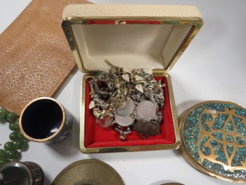 A BOX OF COLLECTABLES TO INCLUDE AN ANTIQUE JAPANESE FAN WITH WOOD BLOCK PRINT DECORATION, A SNUFF BOX ETC