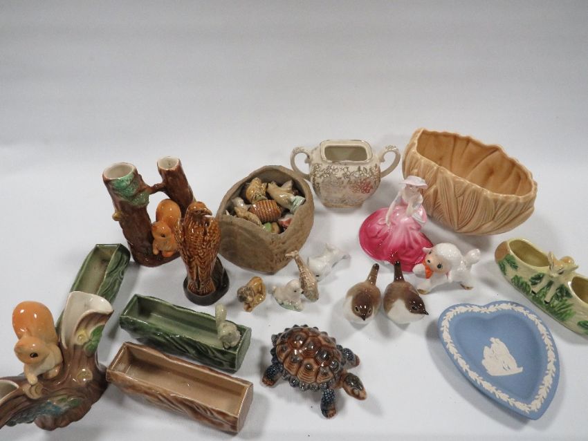 A TRAY OF COLLECTABLE CERAMICS TO INCLUDE WADE, WEDGWOOD, COALPORT ETC