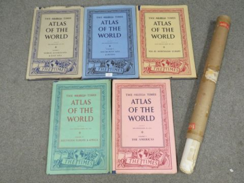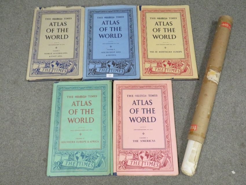 VOLUMES I-V OF 'THE TIMES ATLAS OF THE WORLD' COMPRISING THE AMERICAS, S. EUROPE & AFRICA, NORTHERN EUROPE, SOUTH-WEST ASIA AND RUSSIA AND AUSTRALIA & SOUTH RUSSIA, TOGETHER WITH A SELECTION OF WW2 PERIOD ORDNANCE SURVEY WAR OFFICE MAPS