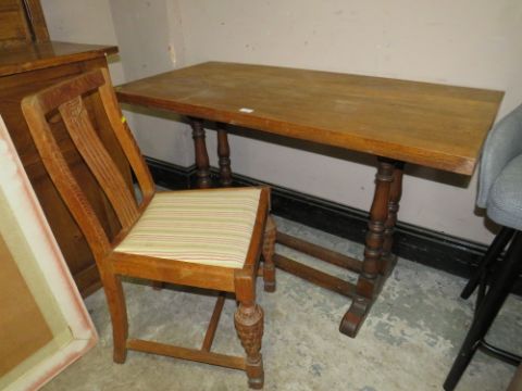 A 20TH CENTURY OAK RECTANGULAR REFECTORY TABLE - W 122 cm AND A CHAIR