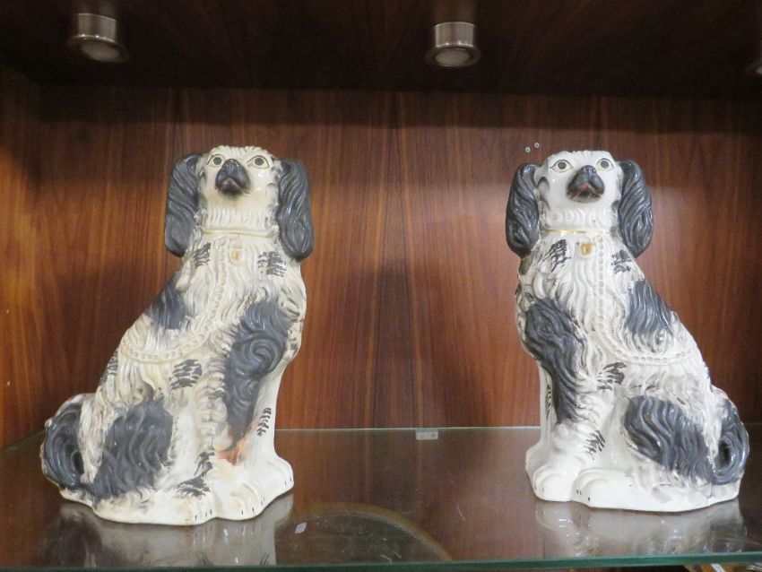 A LARGE PAIR OF BLACK AND WHITE STAFFORDSHIRE DOGS
