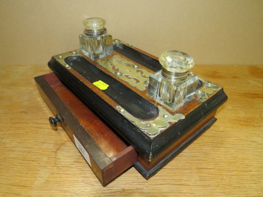A VINTAGE BRASS BOUND DESK TIDY WITH INKWELLS AND DRAWER