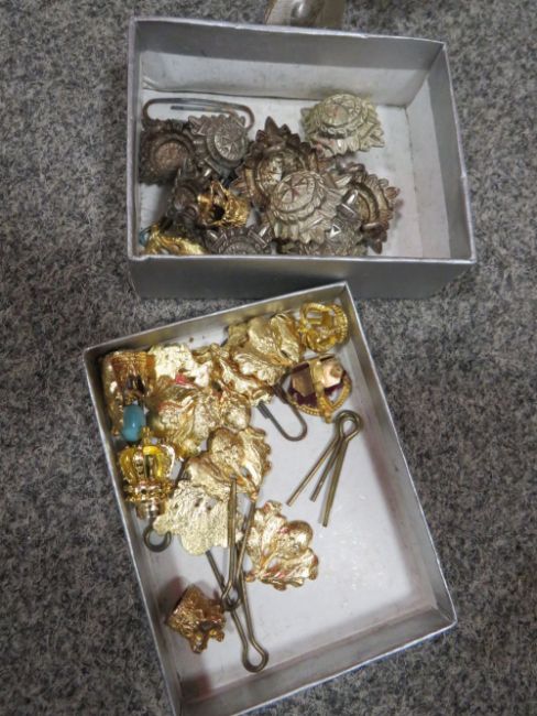 A SELECTION OF MILITARIA TO INCLUDE A VICKERS MACHINE GUN SIEGE LAMP A 1895 BERNDORP GUN SHELL VARIOUS BUTTONS. BOMBARDIER BELT AND SATCHEL