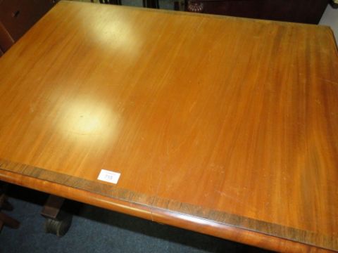 A 19TH CENTURY CROSSBANDED MAHOGANY SOFA TABLE, with two frieze drawers, raised on shaped supports and turned stretcher, W 150 cm