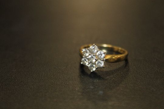 AN 18 CARAT GOLD 1 CARAT DIAMOND CLUSTER RING, set with 7 brilliant cut diamonds, ring size P