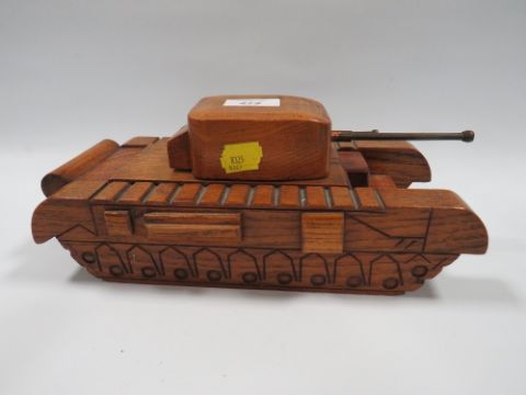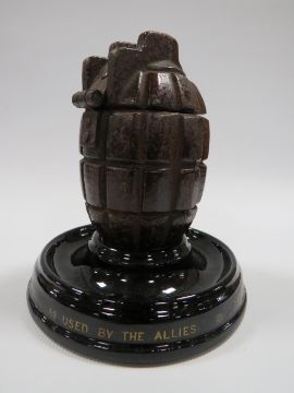 A NOVELTY TREEN BOX IN THE FORM OF A TANK TOGETHER WITH A FIRST WORLD WAR HAND GRENADE INKWELL