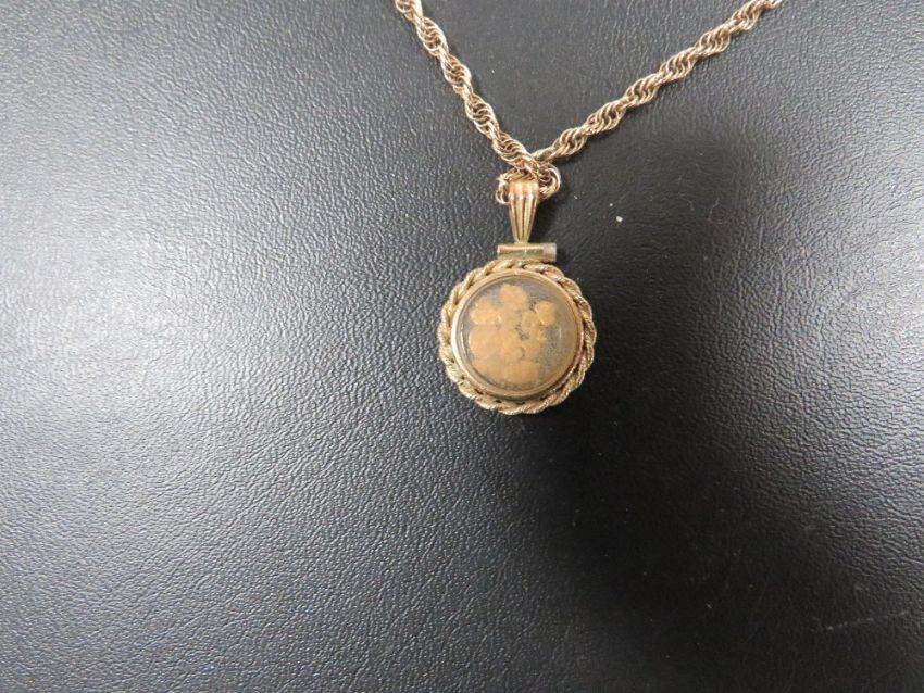 A HALLMARKED 9 CARAT GOLD ROPE TWIST CHAIN WITH PENDANT CONTAINING FLAKES OF GOLD approx weight of chain 4.1g
