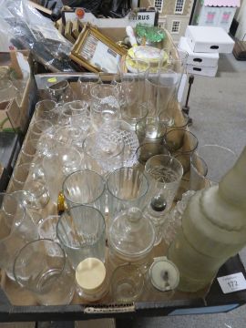 THREE TRAYS OF ASSORTED GLASSWARE TO INCLUDE ENAMEL DRESSING TABLE ITEMS AND A MINIATURE WATERFORD CRYSTAL CLOCK ETC