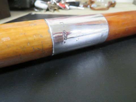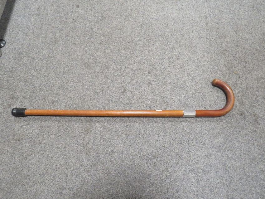 A MALACCA WALKING STICK WITH HALLMARKED SILVER BANDING
