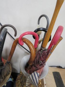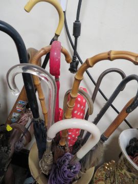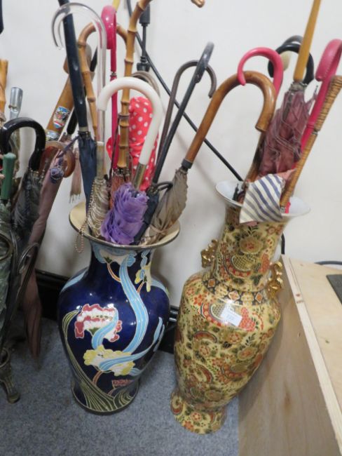 TWO LARGE CERAMIC VASES CONTAINING A COLLECTION OF VINTAGE PARASOLS