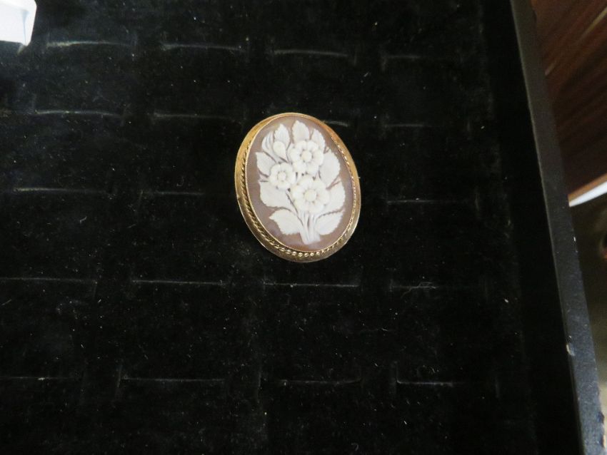A HALLMARKED 9 CARAT GOLD CAMEO BROOCH WITH FLORAL DESIGN