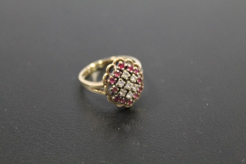 A HALLMARKED 9 CARAT GOLD RUBY AND DIAMOND CLUSTER RING approx weight 3.6g