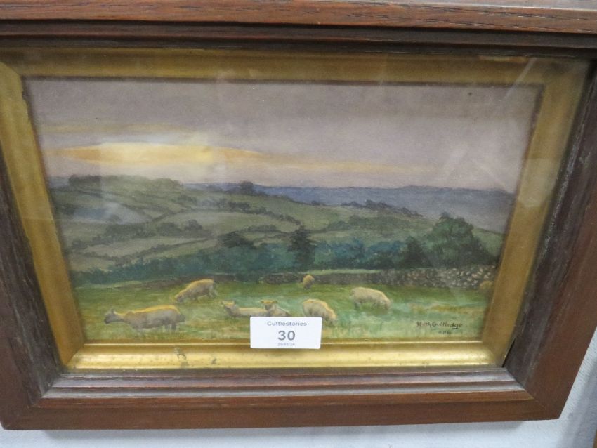 A FRAMED AND GLAZED WATERCOLOUR OF SHEEP GRAZING, HILLS BEYOND, SIGNED AND DATED RUTH CARTLIDGE 1916, 14 X 23 CM