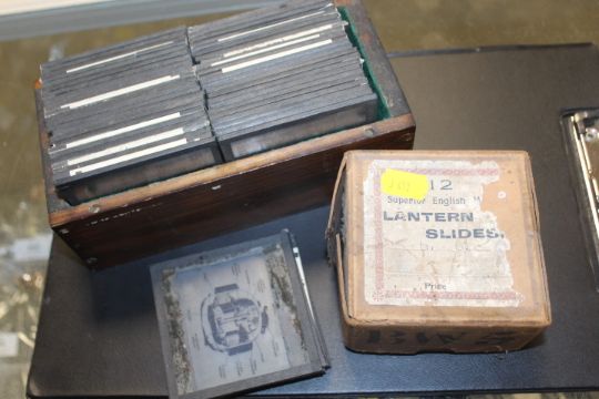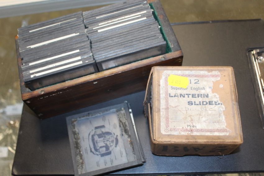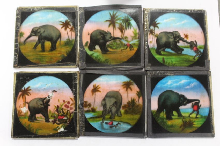 A SELECTION OF MAGIC LANTERN SLIDES TO INCLUDE ENGINEERING EXAMPLES AND A BOX OF COLOURED LANTERN SLIDES CALLED "THE ELEPHANT REVENGE"
