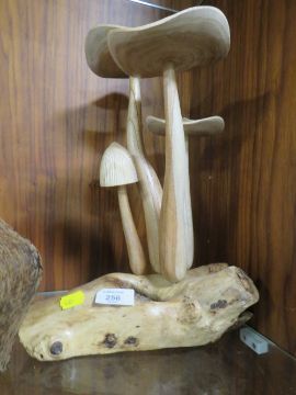 A WOODEN MUSHROOM DISPLAY