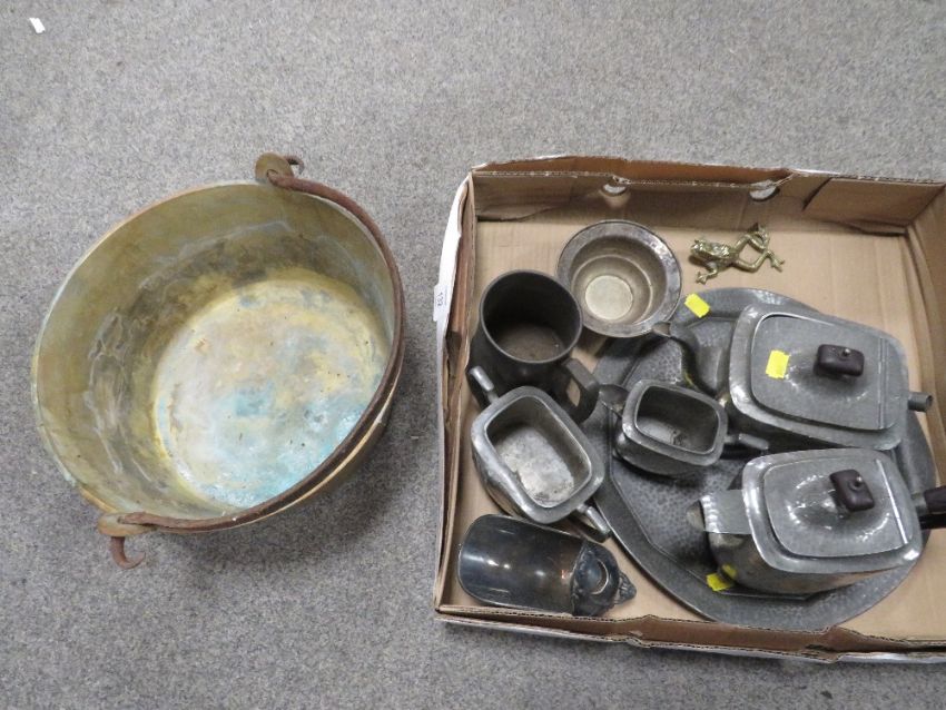 A TRAY OF ASSORTED PEWTER WARE TOGETHER WITH A BRASS JAM PAN