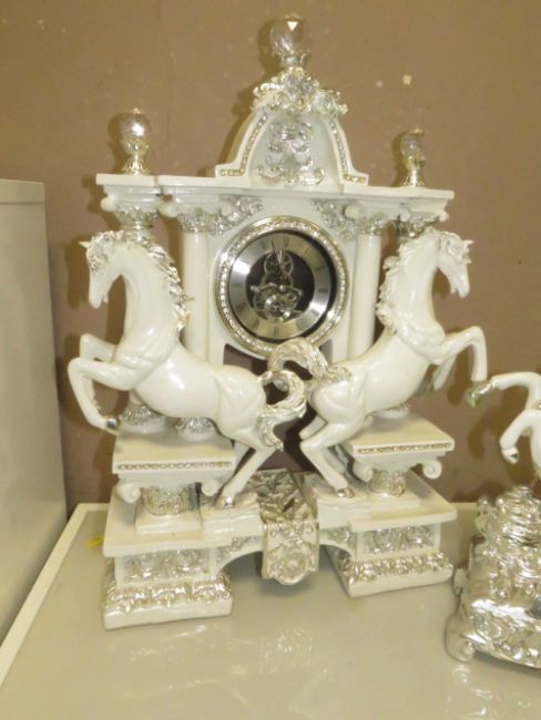 A LARGE WHITE AND SILVER EQUESTRIAN THEMED CLOCK H-58 W-38 CM AND A TELEPHONE (2)