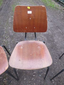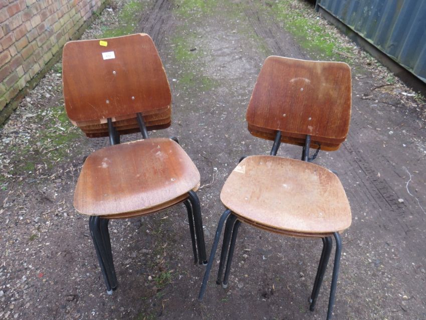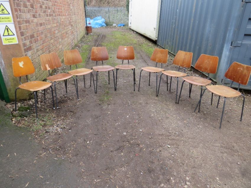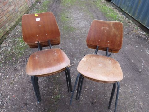 A SELECTION OF NINE STACKING INDUSTRIAL STYLE METAL AND WOOD CHAIRS