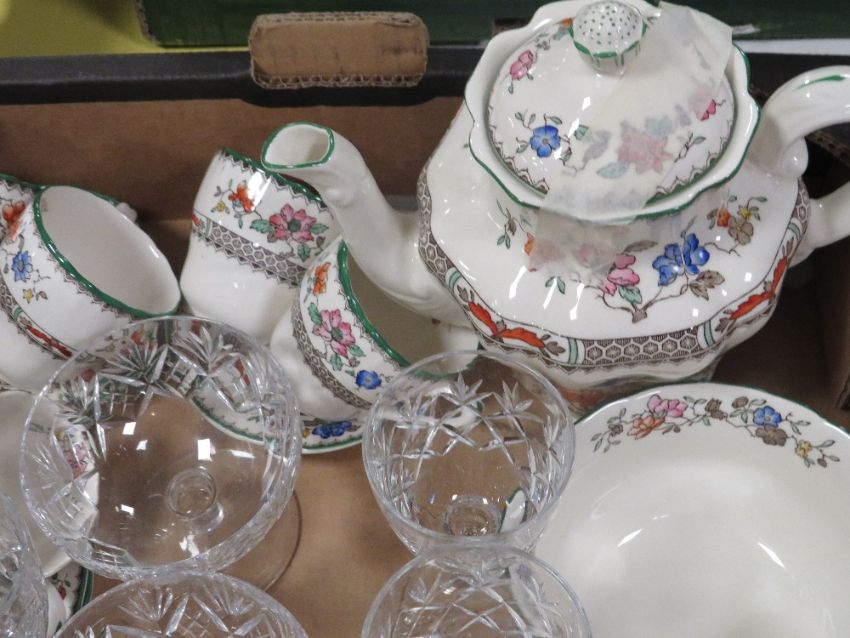 A TRAY OF CERAMICS AND GLASS TO INCLUDE A EDINBURGH CRYSTAL CUT GLASS BOWL