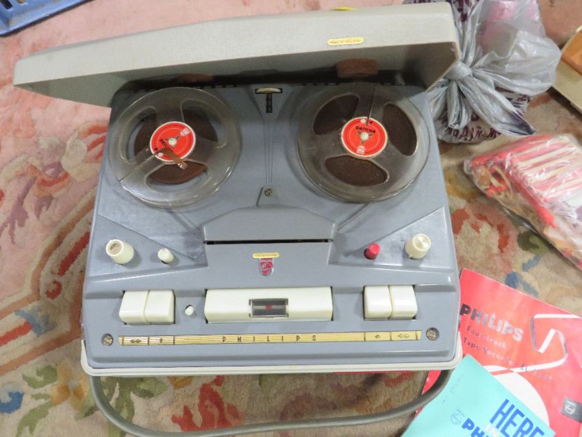 A CASED PORTABLE PHILLIPS REEL TO REEL TOGETHER WITH A BOX OF VINTAGE HAIR CURLERS