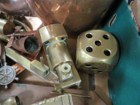 A TRAY OF METAL WARE TO INCLUDE COOPER WARE, BRASS CANDLESTICKS ETC