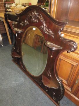 AN EDWARDIAN MAHOGANY OVERMANTLE MIRROR