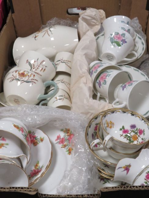 A TRAY OF ROYAL ALBERT BRIGADOON TOGETHER WITH A TRAY OF ASSORTED CERAMICS TO INCLUDE AYNSLEY MIKADO, WEDGWOOD SUSIE COOPER ETC