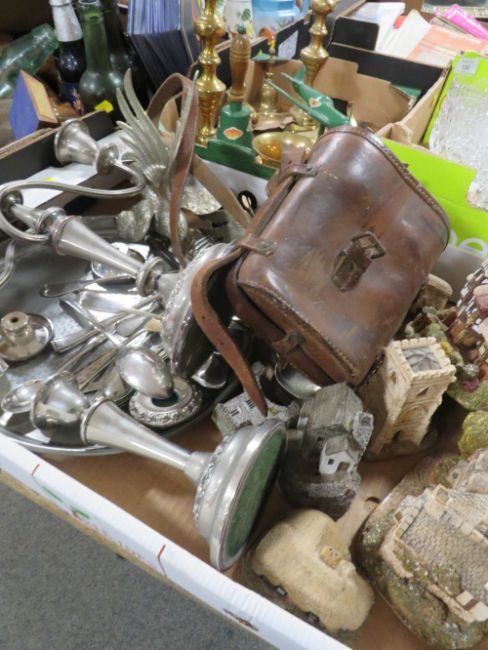 TWO TRAY OF SUNDRIES TO INCLUDE SILVER PLATED WARE , CASED BINOCULARS, LILY PUT LANE COTTAGES ETC